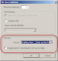 A post at AUGI reminded me of a little feature that Revit has and something that would make it a bit nicer still. When we Save a file or use Save As to create a new file we can use the Options button to display this dialog.