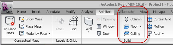 Notice the nice ascending order? Floor, then ceiling and at the top Roof. It's even logical, or at least to me it is. Next is the Revit MEP Architect Ribbon and the Build panel.