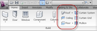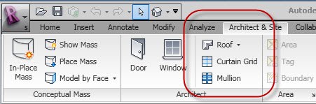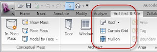 Last is the Revit Structure Architect and Site ribbon tab and the Architect panel. In this case we just have Roof because Floor is elsewhere, part of the structural set of features and ceiling is deemed unnecessary. I suppose this sort of inconsistency doesn't really affect many users but they could be more consistent?