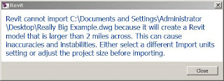 You can test this out yourself. Create a little survey of lines and then park a line more than two miles away from those lines. It could be as simple as two lines very far apart. Import the file and Revit complains.