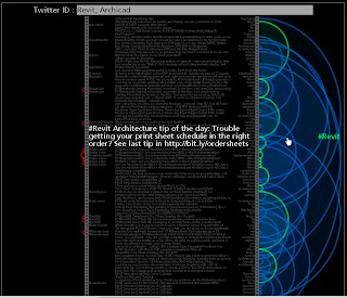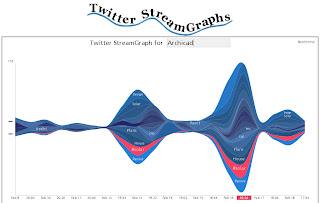 This evening I was reading the post at the Harvard Business Blog post regarding Twitter and data visualization. I thought I'd use these four Twitter data mining tools to see how Revit and Archicad compare in the Twitterverse. I don't think they are particularly meaningful or even useful, but they make nice images? All four of these examples are hosted at Neoformix. The site title reads, "Discovering and Illustrating Patterns in Data".