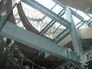 I took this photo looking up into the pint glass before catching an escalator, a couple of which feature an unusual combination of flat sections and sloped sections. It was a little strange to ride "out", then up only to ride "out and over" to the landing. You can just make out the escalator doing this in the right side of the next picture, encased in a veneer of drywall.