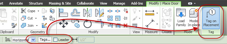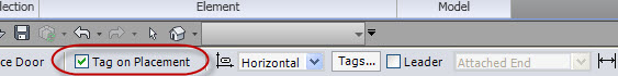 Previous releases of Revit offered a check box to decide if we wanted a tag to show up as we placed various elements. For example placing a door offered us this on the Options Bar.