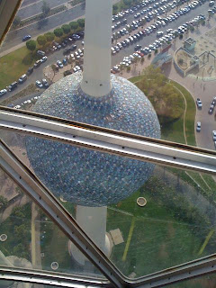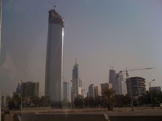 Great views of the city from the observation level at 120 meters (at least that's what the elevation read out when we got to that floor). There is the new Al Hamra 74 story tower rising, nearly topped out, designed by SOM. This is it, but not the interesting twisty side of it though.