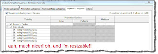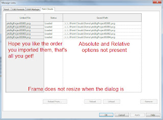 Which brings me to re-sizing the dialog. They've been diligently fixing these over the last few releases. The Manage Links dialog does re-size (stretch/contract) and all the tabs information within does too, except...you guessed it...the Point Clouds data frame. This just adds insult to injury when I'm hunting for a scan and they aren't "in order"...and the frame I'm hunting in is a fixed size.
