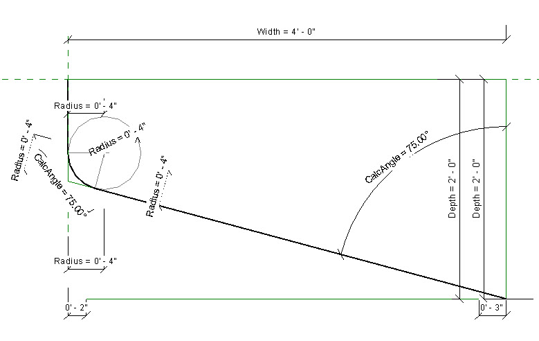 This final one is the simplest in appearance but it has two line segments instead of one along the angled segment. I noticed that connecting the end of the angled line would break the relationships. I tried pulling the end of the line away from the end of the arc, leaving them apart, and flexing geometry worked. That led me to try a second line between the end of the arc and the end of a smaller line and it worked too. Not obvious at all. It also means that the family will break if one of these segments is flex too far, assuming the changes result in a zero length segment. The family will break easily anytime the angle entered creates a zero length segment of the vertical line too (all of them, not just this one). Fragile but the family works.