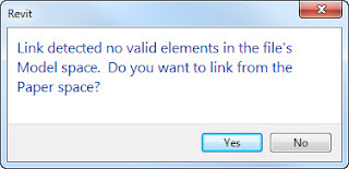 It's especially confusing if you just were looking at the file in AutoCAD and know there are elements there. Worse you'll probably see the first dialog again if there isn't any data in Paper Space to import either. Even worse is when you find out it is all "your" fault. Well at least in this case it was my fault.