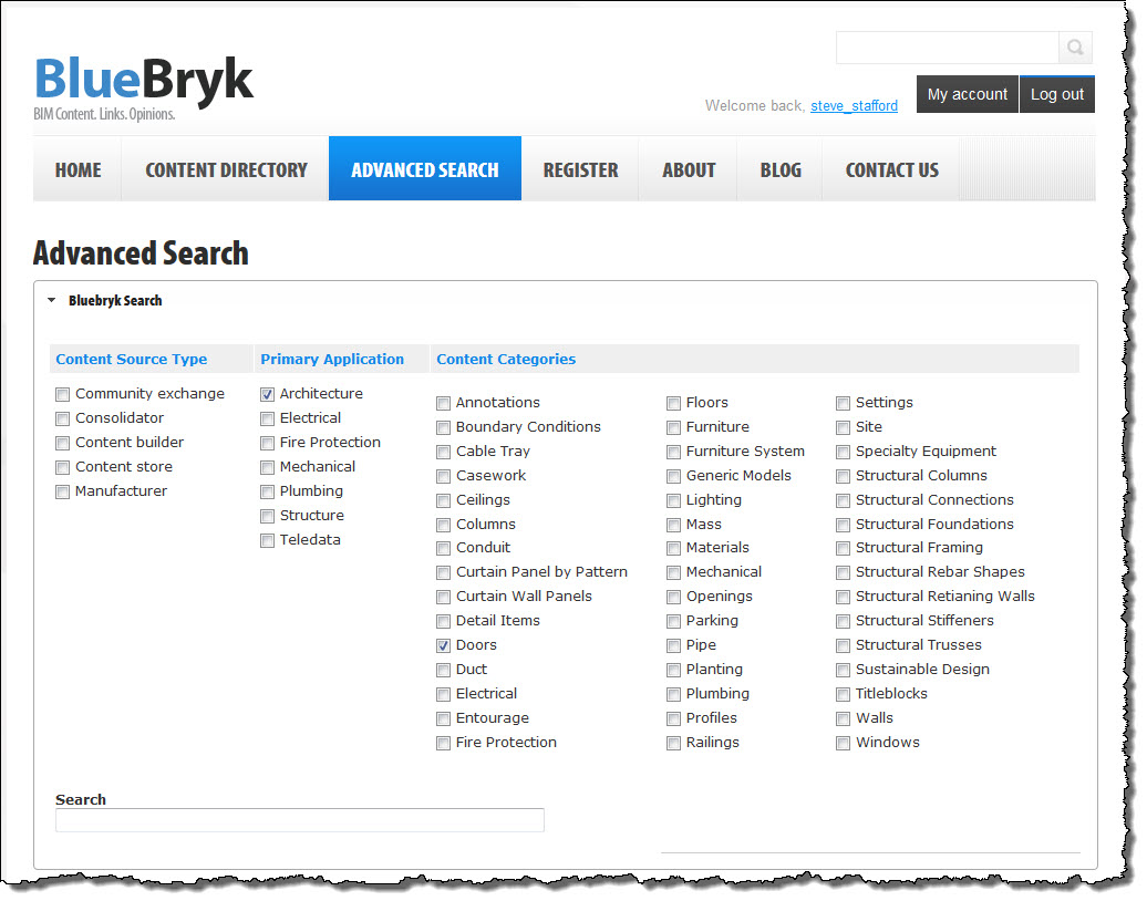 If you visit the BlueBryk site you'll find a clean organized place (a bit of expected blue here and there too). At the very top is a button called "Why Register". That was my first question too, with a cynic's mindset, "Why do I care?". The first reason offered is access to advance searching criteria, which is certainly valid. I think the biggest reason is to give me access to voting on content providers. After all if I really want to make the site work we all need to give feedback into the quality of the content we find. Autodesk's Seek, the more or less obvious "competing" resource, doesn't really deliver on real user rating systems (we can submit feedback), at least not in a "social" way.