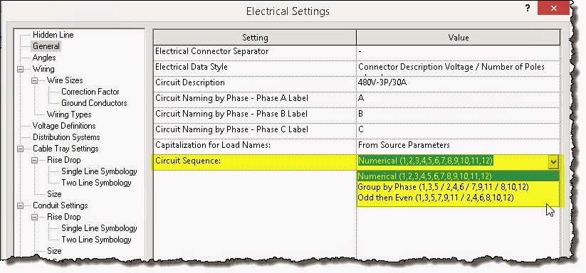 Somewhat related to yesterday's new electrical feature there is also a new Electrical Setting called Circuit Sequence. There are three choices: Numerical, Group by Phase and Odd then Even (a common request, to fill one side of the panel and then the other).