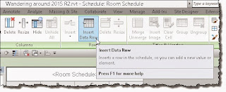 In August of 2013 I wrote to complain about the placement of the Data Row button to create a new room, area, space or sheet in a schedule. I'm happy to write that they listened to me (and everyone else). The latest update release for 2015 has dedicated a little bit of ribbon real estate to a Insert Data Row button on its own. Fewer clicks for click counters to click (or count)!