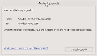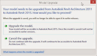 I wrote on Monday that Revit 2015 R2 warns us if we are opening an older file that will need to be upgraded first. Daniel Stine let me know that a different dialog appears if you double click a file to open it. Now I don't do that and don't recommend you do that either. Here's the dialog that appears if you do though and this one waits till you respond.