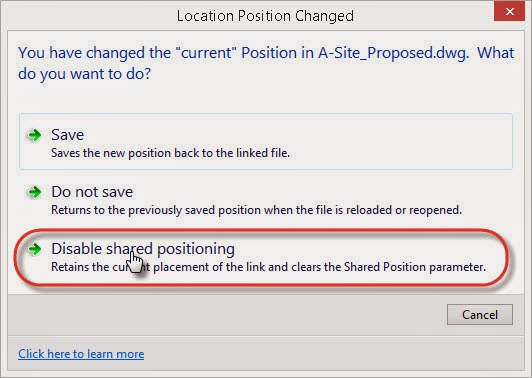 When we save our project we may receive this warning. In this circumstance choose the bottom option Disable shared positioning...