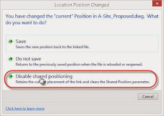 Now regarding the title of this post, importing the rest of the files. Once shared coordinates are defined based on our first file we can import other site files using the positioning option: by Shared Coordinates. This assumes that each of the site related files are already aligned with each other using the same WCS origin. When we link a file this way a warning will appear while it is loading.