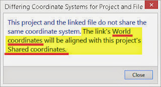 The last part of the warning is the significant part, The link's World coordinates will be aligned with this project's Shared coordinates". That means it will line up correctly because our project is aligned with the same WCS and both cad files already use the same WCS origin between themselves. Clicking Close accepts the warning and the link should land in the correct location. We can repeat this as many times as we have site related files to use.