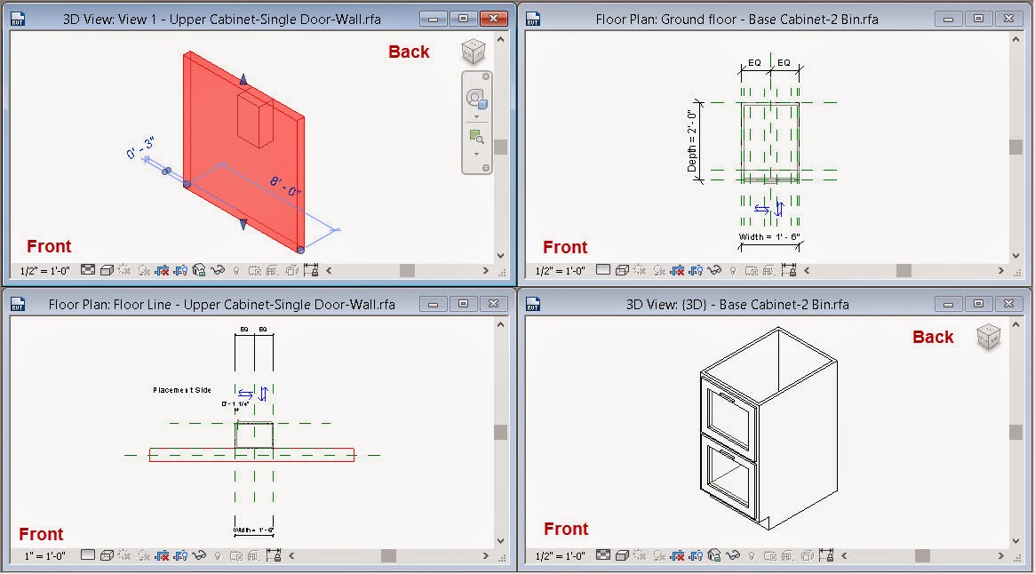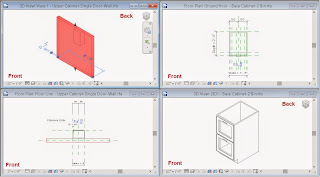 Another apparent mismatch of orientation logic is base cabinet and wall/upper cabinet casework. Base cabinets are modelled with front facing the bottom of the plan view but the wall hosted upper cabinets are facing the back, the top of the plan view, opposite of base cabinets. Placing them in a project however defies the apparent orientation mismatch because the origin of the base cabinet is at the back and it is for the upper cabinet too. This means they orient logically when used together despite being modelled facing different directions in the family editor.