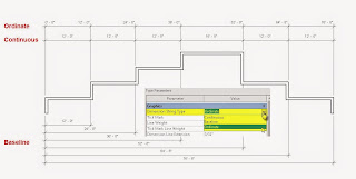 That parameter name seems a bit like the Department of Redundancy Department. It lets us choose between three kinds of dimension behaviors: Continuous, Baseline and Ordinate. We are all pretty familiar with Continuous. I've spent time doing mechanical drafting (aka shop drawings) in the past and it wasn't uncommon to use some form of the other two types of dimensions. This is what the three of them look like together.
