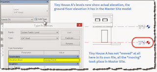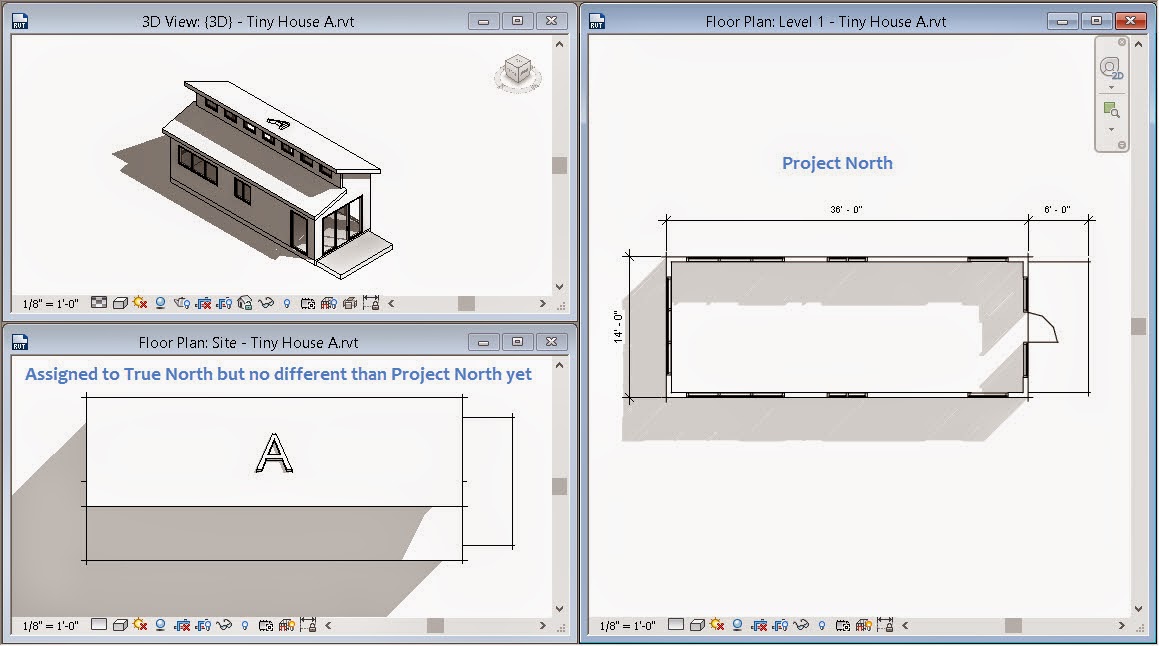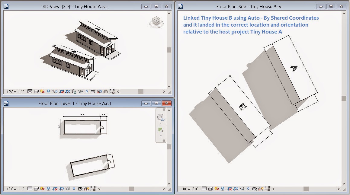 It is necessary to make sure others are not working on the Tiny House A or B now. The Save will fail if someone is working on them. Just ask them to close the project for a minute. When worksharing is involved the same is true but it is a bit more forgiving. Either way, if an error message appears you need to ask others to stop working on these files briefly; they need to Save and close them. Once my Save is completed they can get back to work.When I open Tiny House A I find that the Site plan is oriented to True North. I changed the Orientation parameter to True North earlier (noted in the image at the beginning). All plan views in the stock templates are assigned to Project North, including the Site view. Changing it meant that I'd see the results of using Publish Coordinates immediately, or at least as soon as I bother to open the Site view. The reality of this is that the project is NOT altered materially, no physical change to any geometry, it is just oriented correctly based on my actions in Master Site. This trivializes the task of re-positioning a building on site, if that becomes necessary.