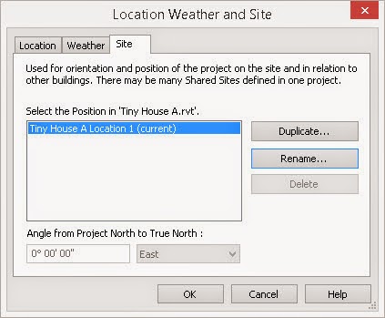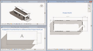 Yesterday I ended the post with a list of steps that I'd take to create a relationship between my building project file(s) and the Master Site file. I started another pair of projects that I'm calling Tiny House A and B (inspired by Sean's Tiny House project). I can start a project with or without site context. Revit's bias is making the project easy to document, forget about True North initially. It is trivial to resolve that in the Master Site file once it is ready, regardless if it is created before or after the tiny house models are started.
