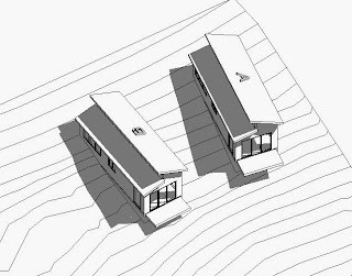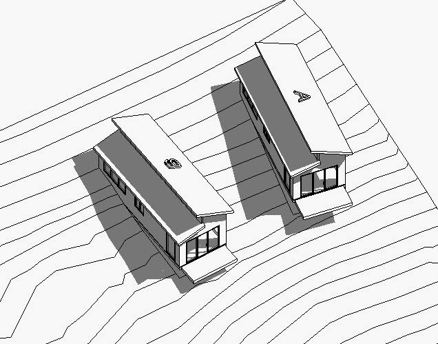 I learned while reading the development's covenant and zoning requirements that these houses can't be closer than 15'-0 to one another. I decided to put Tiny House B 18'-0" from A. I heard that A's owner is a drummer so those extra three feet might help keep B's sanity. I also decided that the ground floor elevation for B should be 20'-0", a little bit lower than A.
