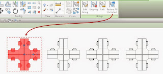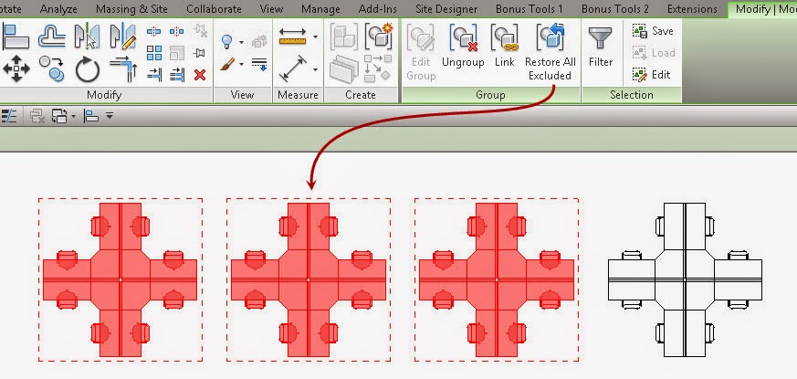Three of these four instances of a quad workstation Group have had Elements Excluded. The group has both possible seating positions included for each workstation and I can just exclude the one I don't need. When I select one group I get the Restore All Excluded button on the ribbon.