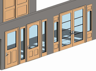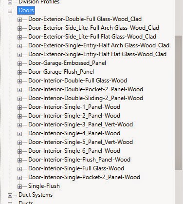 There are door families (12 each) on their own within the Doors folder and several use Type Catalogs (6 each). You'll also find the three Curtain Panel Doors we are used to seeing in the library though they've been renamed a little. In fact all doors now include Door- as a prefix to declare their category. The curtain panel doors are always a source of confusion because they are doors in a door folder that can only be placed in the model by swapping them for a curtain panel.