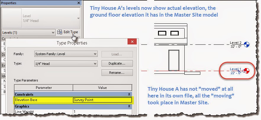 Taking things a little further, each Level type has a Type Parameter called Elevation Base. It can be assigned to either Project Base Point or Survey Point. When I change this to Survey Point I find that the levels are reporting elevation values based on how much I raised Tiny House A in the Master Site file.