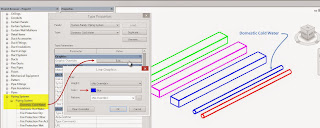 Now the file has been linked to an architectural model. The colors assigned to the pipe system are still applied to the elements. You might be tempted to try to alter the settings of pipe and duct systems in the Project Browser, IF you've noticed that your architectural template has them. I'll save you the trouble, it won't do anything to them.