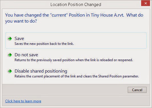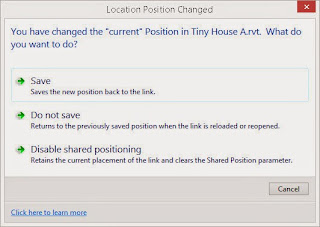 It's significant to appreciate that I could now create a copy of Tiny House A in Master Site and place this copy in another location. I could then use Publish Coordinates on this copy which would allow me to use Duplicate... and use another name like Tiny House A Location 2. In the Tiny House A project file I can now choose between these two named locations and make one of them current. Revit will reorient everything to show the building correctly for this location, all without really changing anything in the model. It's pretty clever and powerful; actually doing it is something I'll save for another post.I used Publish Coordinates again but on Tiny House B and used the name Tiny House B Location 1 when the dialog appeared. I'm ready to return to work on my Tiny House A design. I clicked Save so I can close the Master Site project. The following dialog appears twice, once for Tiny House A and the second time for B. This is confirming that I want to commit the location and shared coordinate changes I made while using Publish Coordinates. I clicked Save each time (2x), the top option in the list.