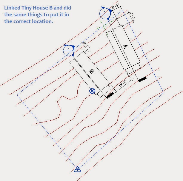 Now that I'm satisfied with the positions of Tiny House A and B I'm ready to use Publish Coordinates. This tool will PUSH the site orientation information to each house's project file. Revit will use this information to shift the house's Shared Coordinate system to align with the Shared Coordinate system of Master Site. In yesterday's post, the Master Site was manipulated to be in alignment with a linked DWG file's WCS (the World Coordinate System in AutoCAD to be precise) through the use of the Acquire Coordinates tool.