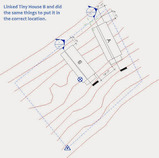 I can also link Master Site into either Tiny House A or B and use Auto - By Shared Coordinates too. They all understand their relationship to each other because of Publish Coordinates and the work I did in Master Site to put them into the proper context with each other. Here is Tiny House A, with Tiny House B linked in. I also created a Toposurface and Building Pads for each house in the Master Site file, then I returned to Tiny House A so I could link Master Site in using Auto - By Shared Coordinates as well.