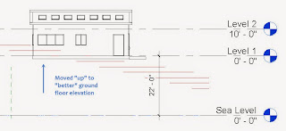 Now I want to make sure the house is at an appropriate ground floor elevation. I created a section view so I could see the site's contours and the floor of the house. I can see here that the house is buried under a fair bit of the site.