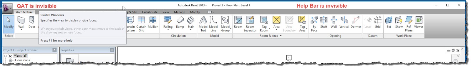 As soon as I got started working I noticed that the Title Bar of the UI is missing the Quick Access Toolbar (QAT) and the Help/Info Bar.