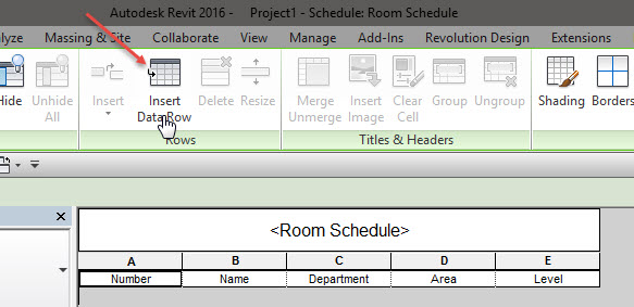 While working in a Room Schedule we can create new rooms via Insert Data Row versus placing a room in the model and having it appear in the schedule. This allows us to assemble a project's programming requirements early or at least at the same time as modeling activities are creating the building. There are two settings that will disable the Insert Data Row tool (using Revit 2016 at the moment). This is what it should look like.