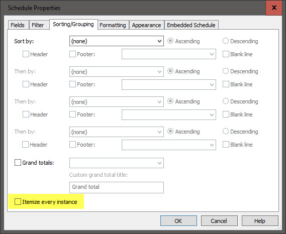 If we don't check the Itemize every instance option on the Sorting/Grouping tab the Insert Data Row is disabled.