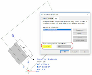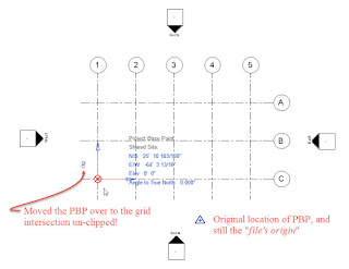 I've posted the revised building model for the HVAC designer and sent them the new rotation information. The coordinates of the benchmark remain the same...the site hasn't changed after all, just the building's location relative to the site. Using SCaP they enter the new information after moving the Survey Point (un-clipped) to the intersection of the reference planes.